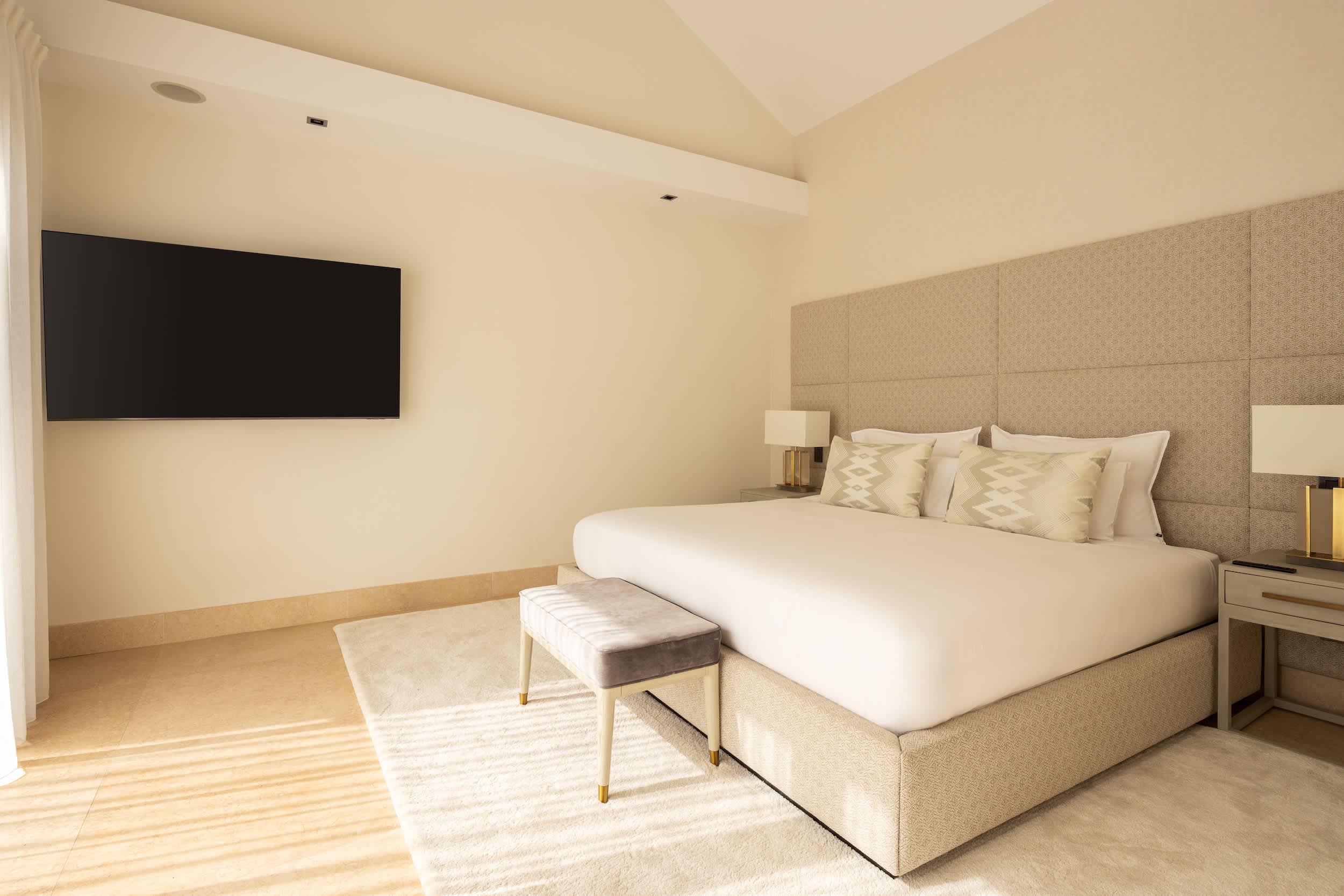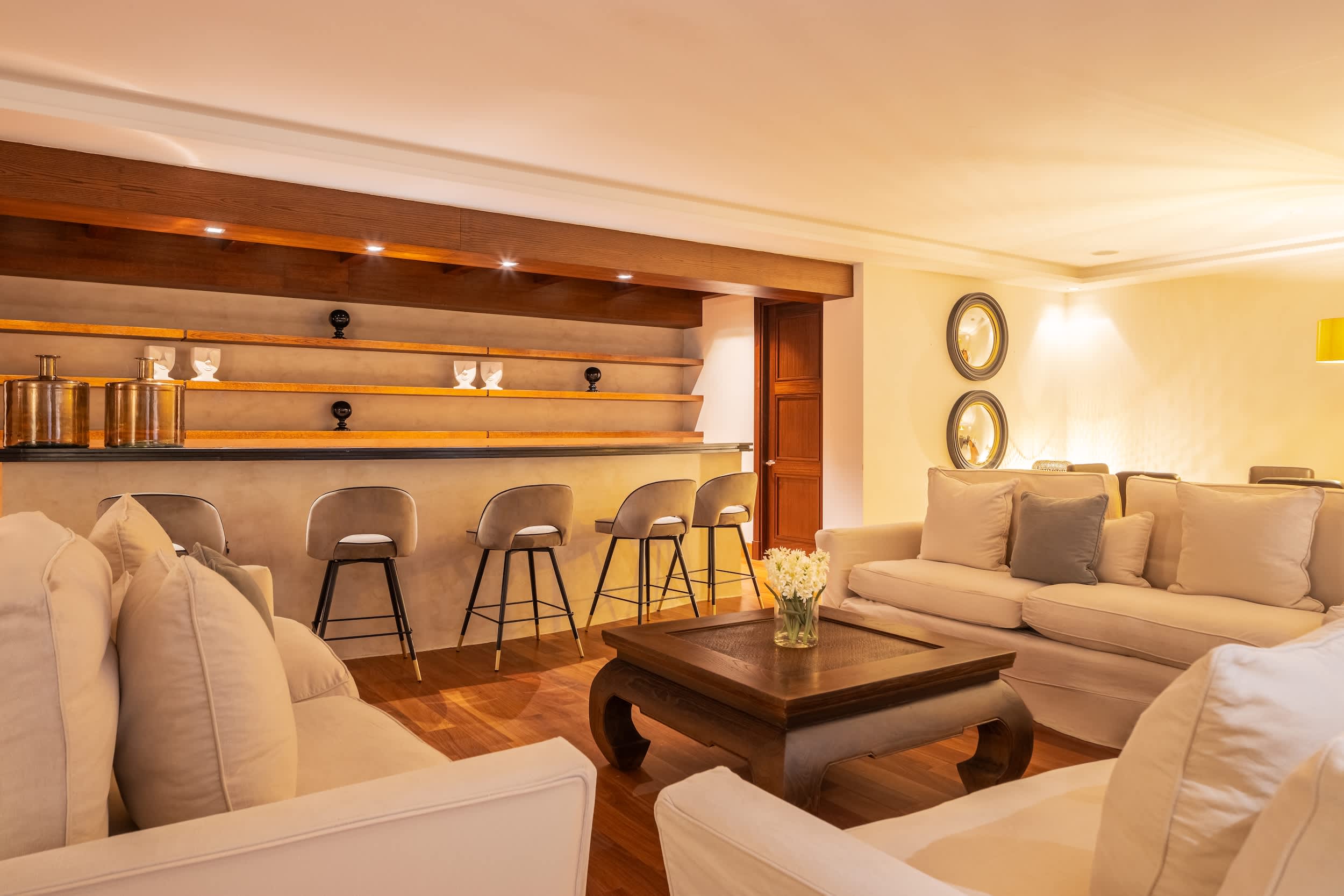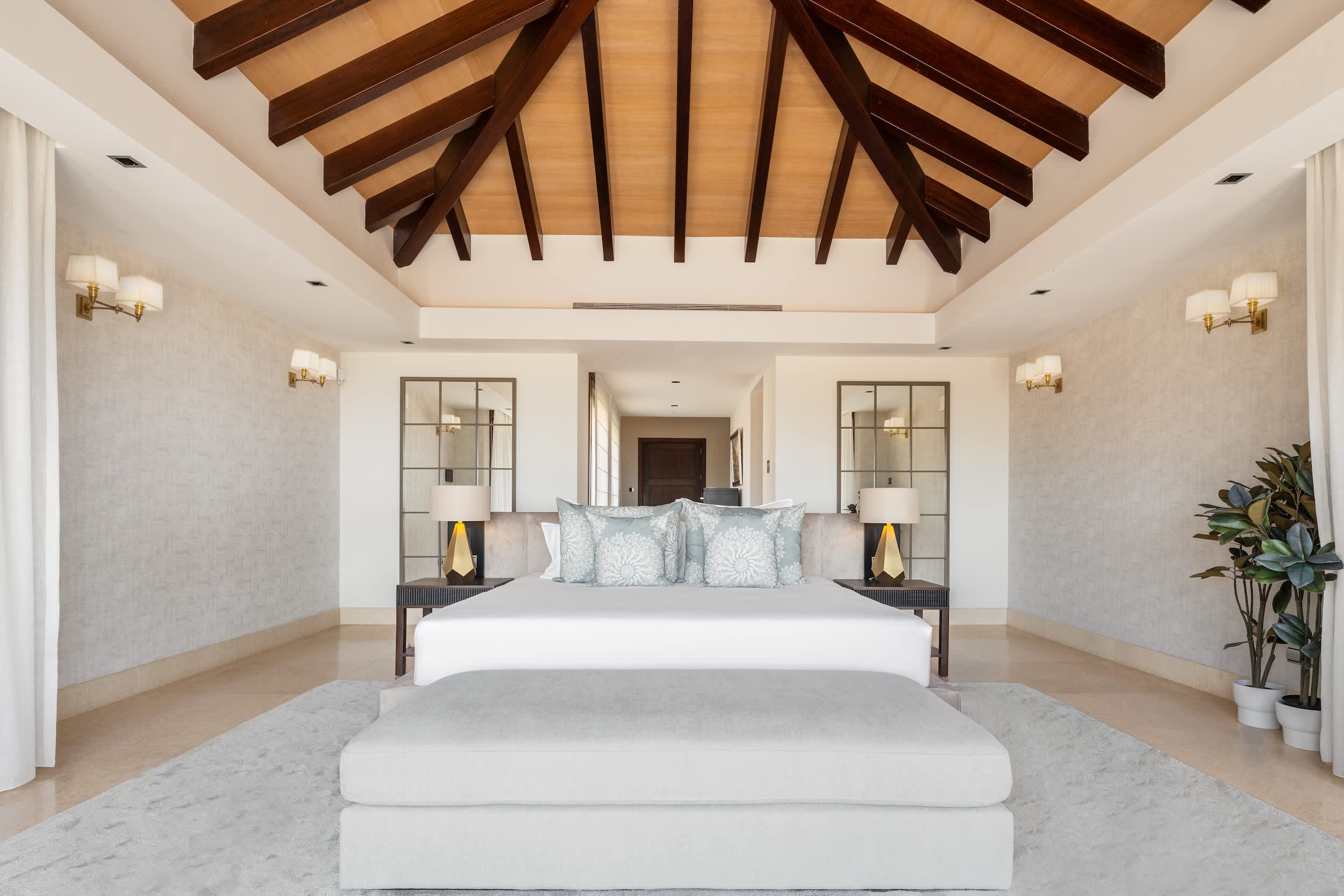 Welcome to this magnificent villa, where luxury greets you from the very entrance with grand marble fountains flanking each side, setting an impressive tone. Inside, the villa boasts five luxurious one bedroom suites and a fully equipped guest apartment, ensuring ample space and privacy. For entertainment, enjoy a private home cinema, a stylish bar and games room, and a fully outfitted gym.