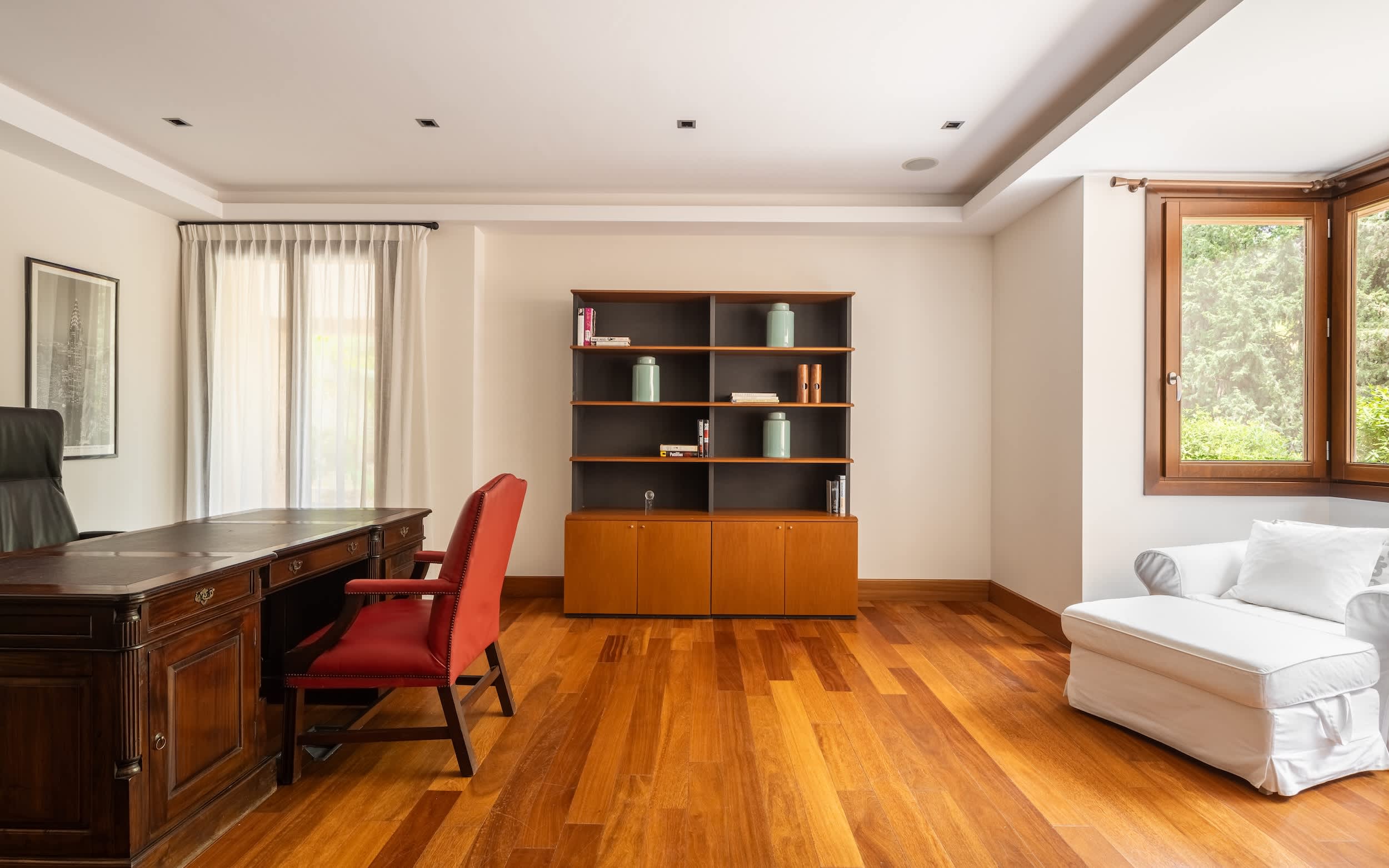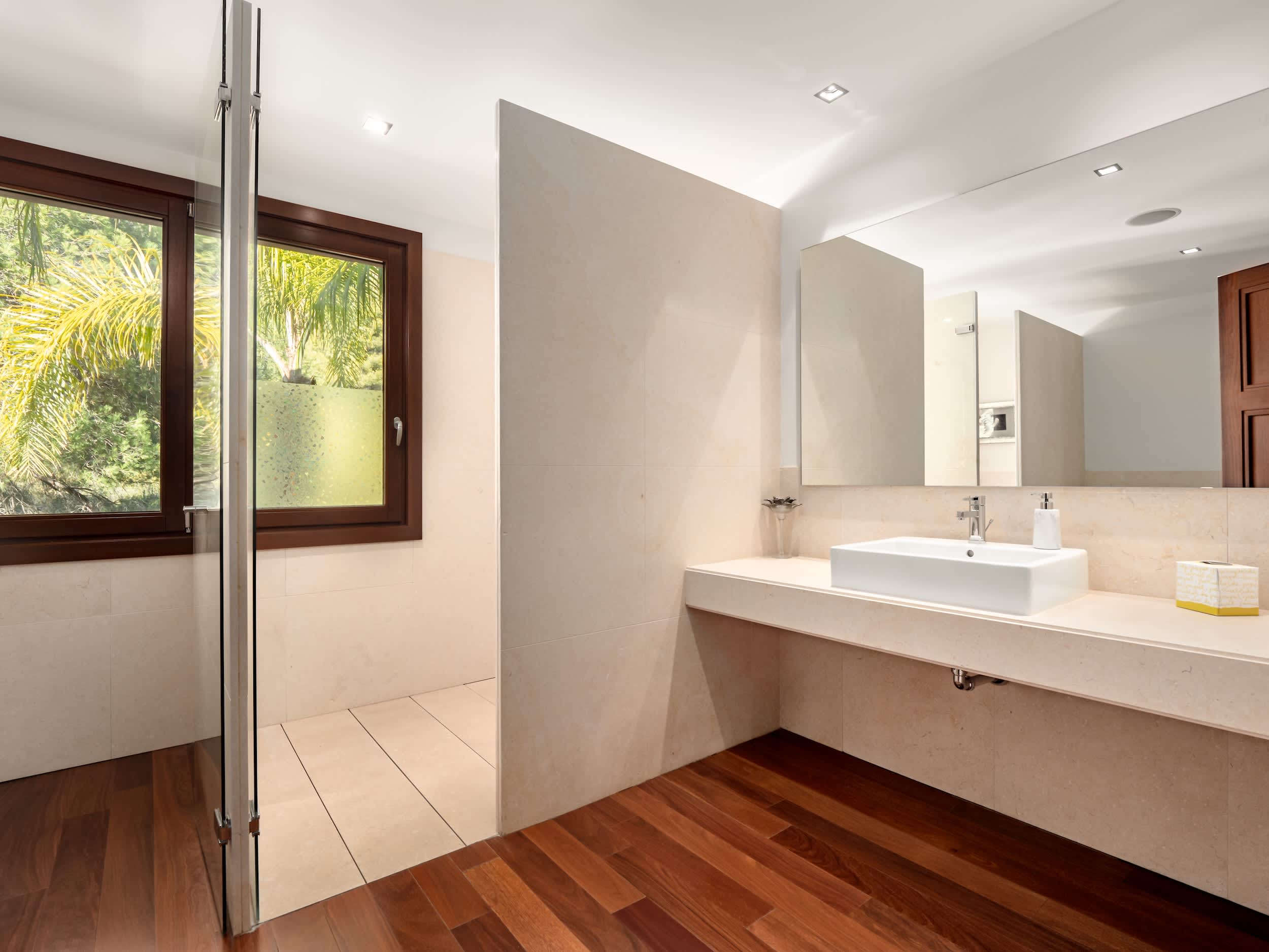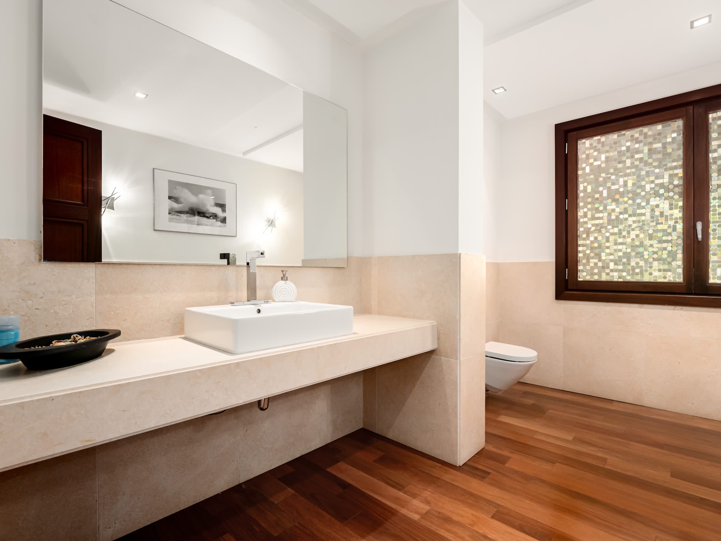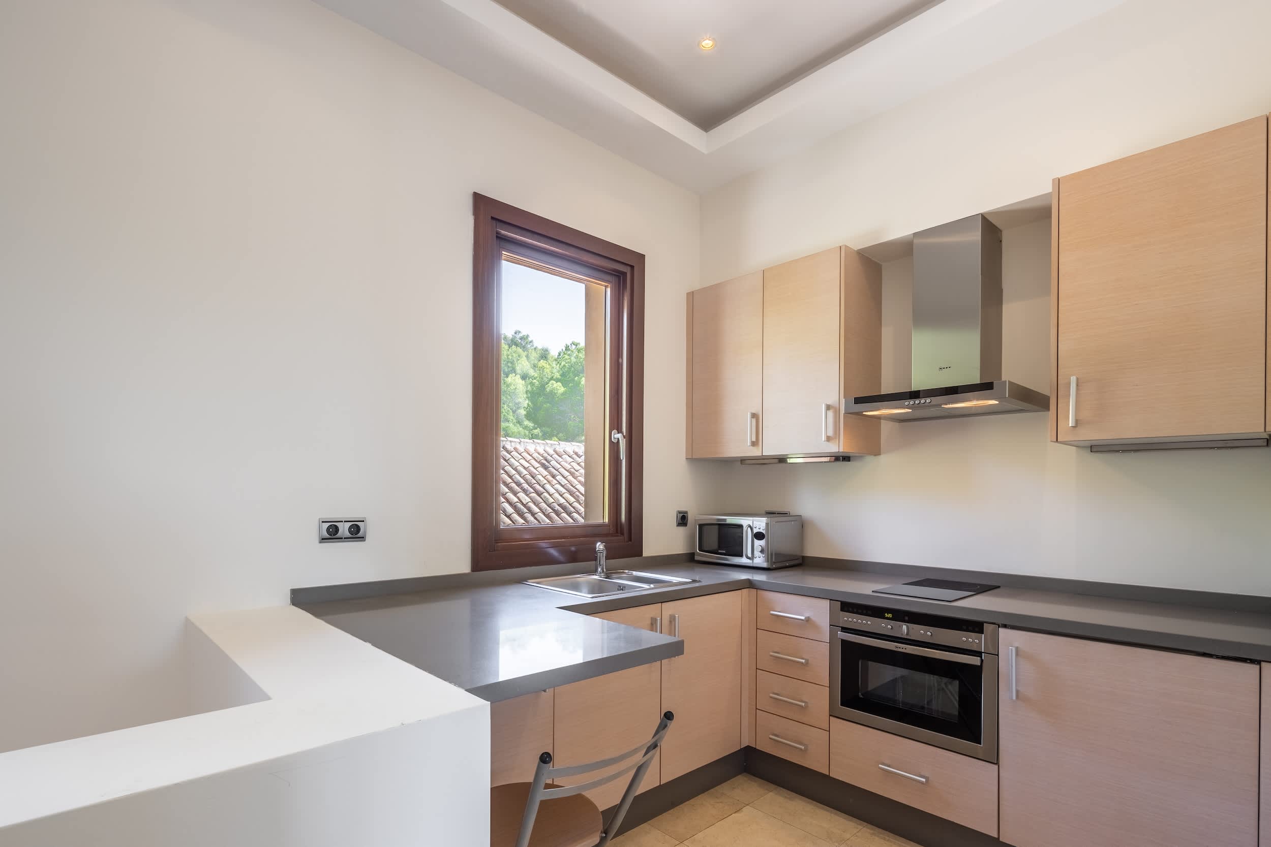 The villa’s amenities are truly world class. Indulge in the complete spa experience with a heated indoor pool, Turkish bath, sauna, and a massage room, all designed for ultimate relaxation. Climate control is seamless, with air conditioning and underfloor heating ensuring comfort in every corner, year-round. Security is prioritized, featuring a comprehensive alarm system with cameras covering the entire property, giving you peace of mind.