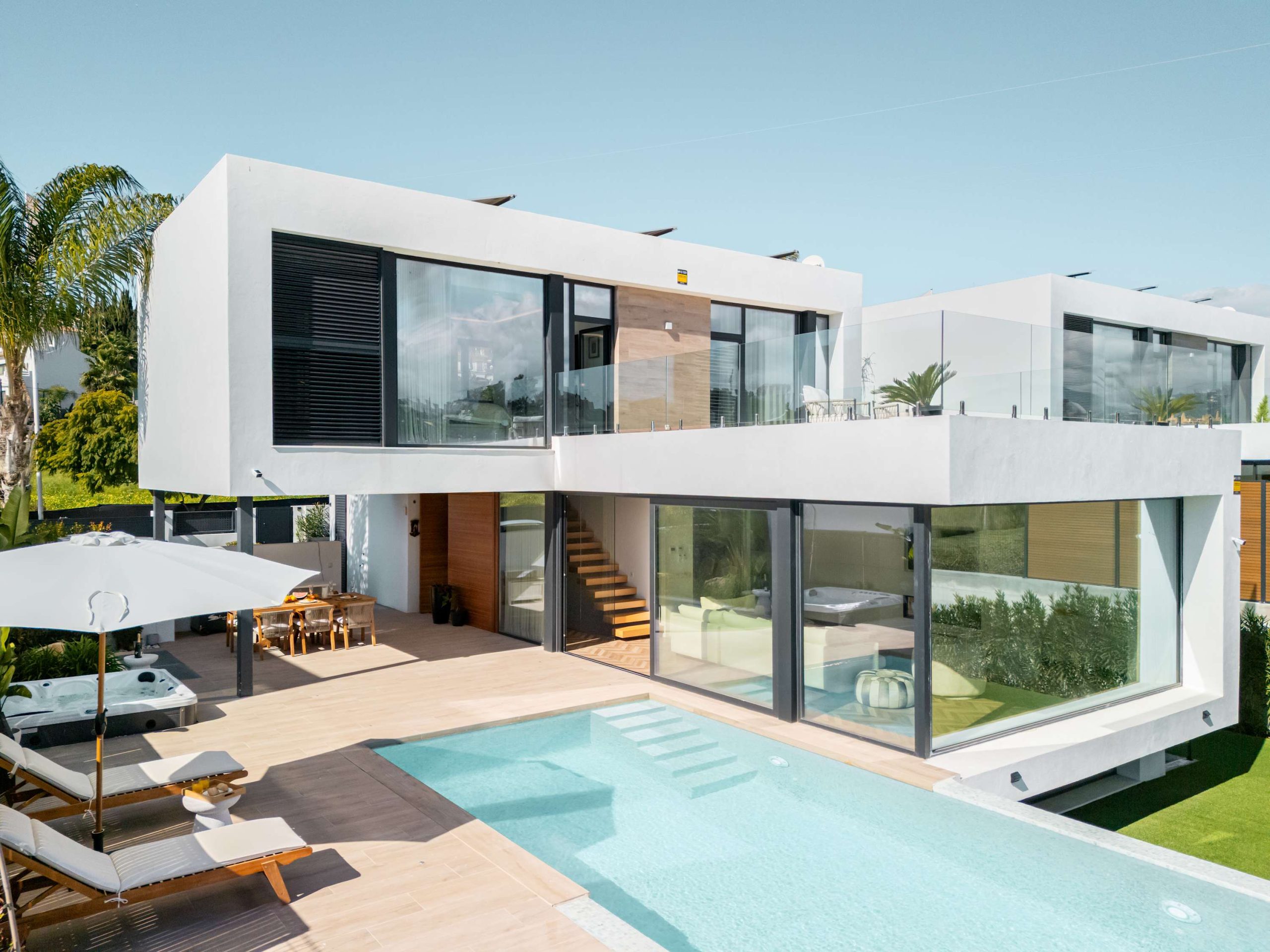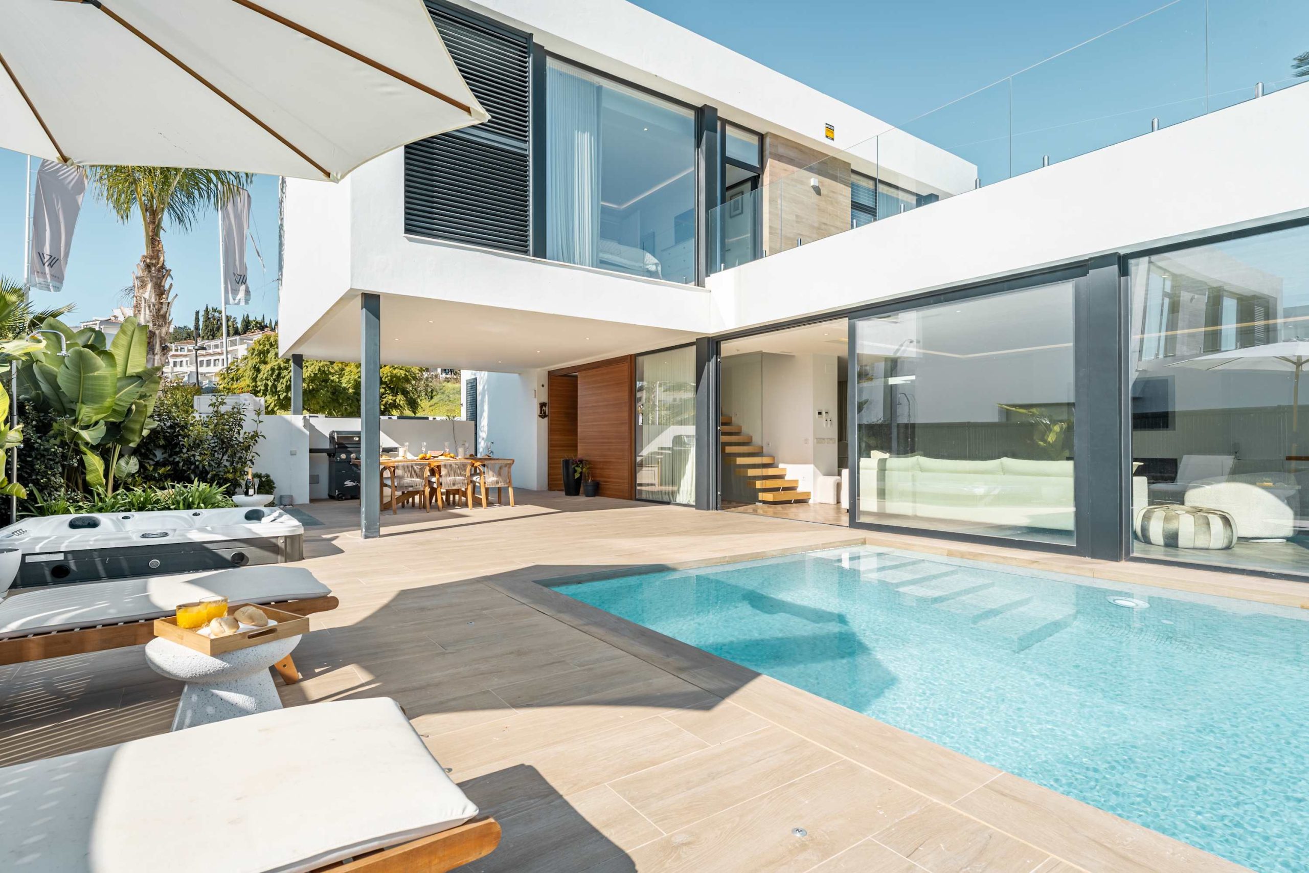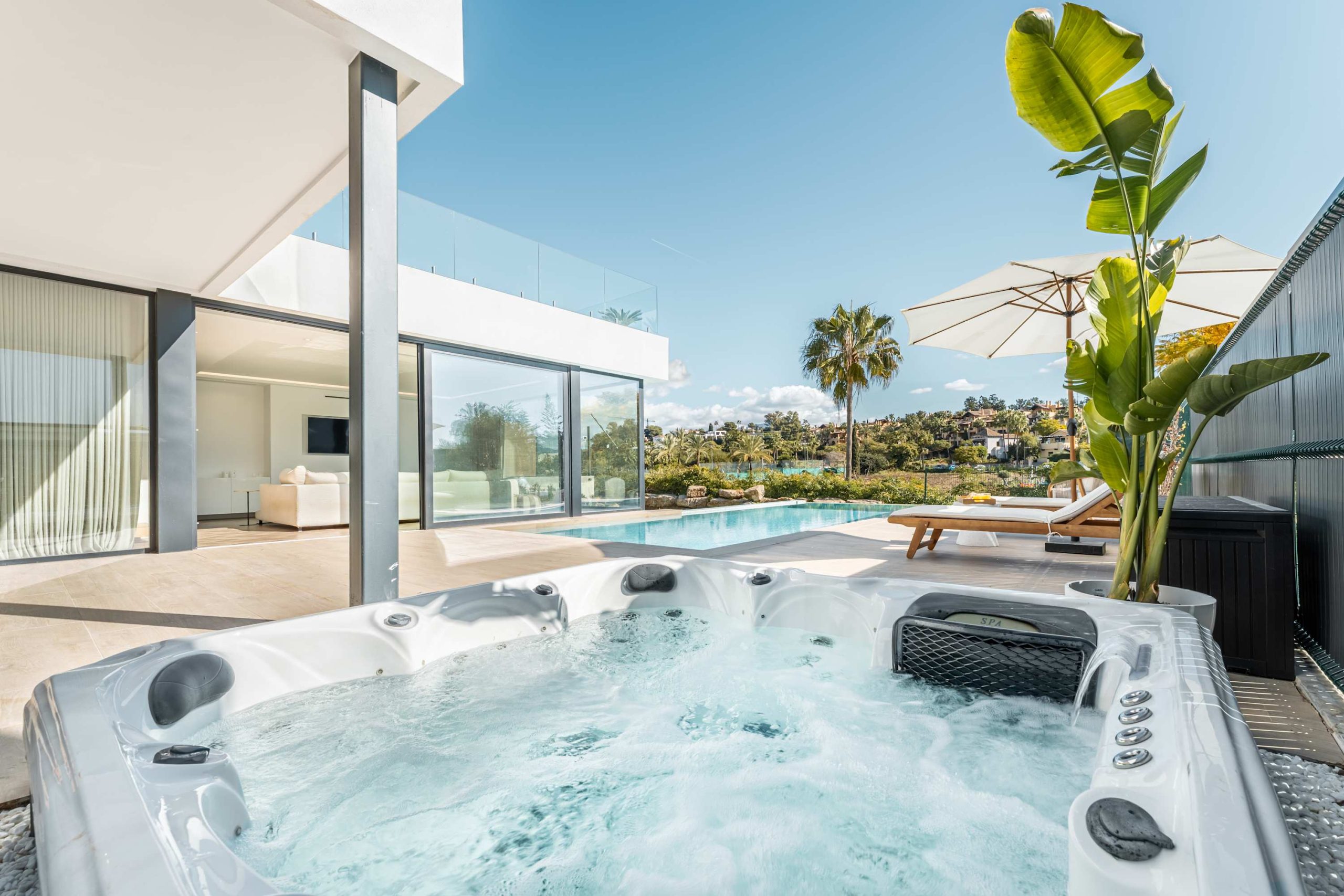 Step outside to a beautiful private garden, where a sparkling pool, sunbeds, and lounge areas invite you to unwind. Enjoy the jacuzzi or simply take in the peaceful surroundings, this villa is designed for relaxation.