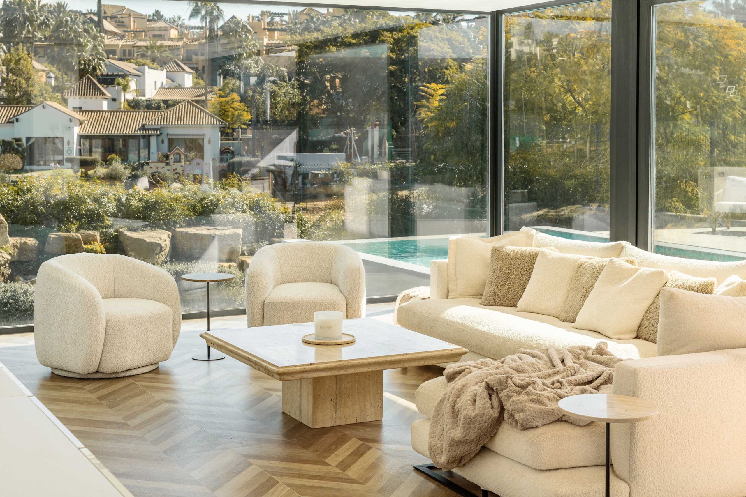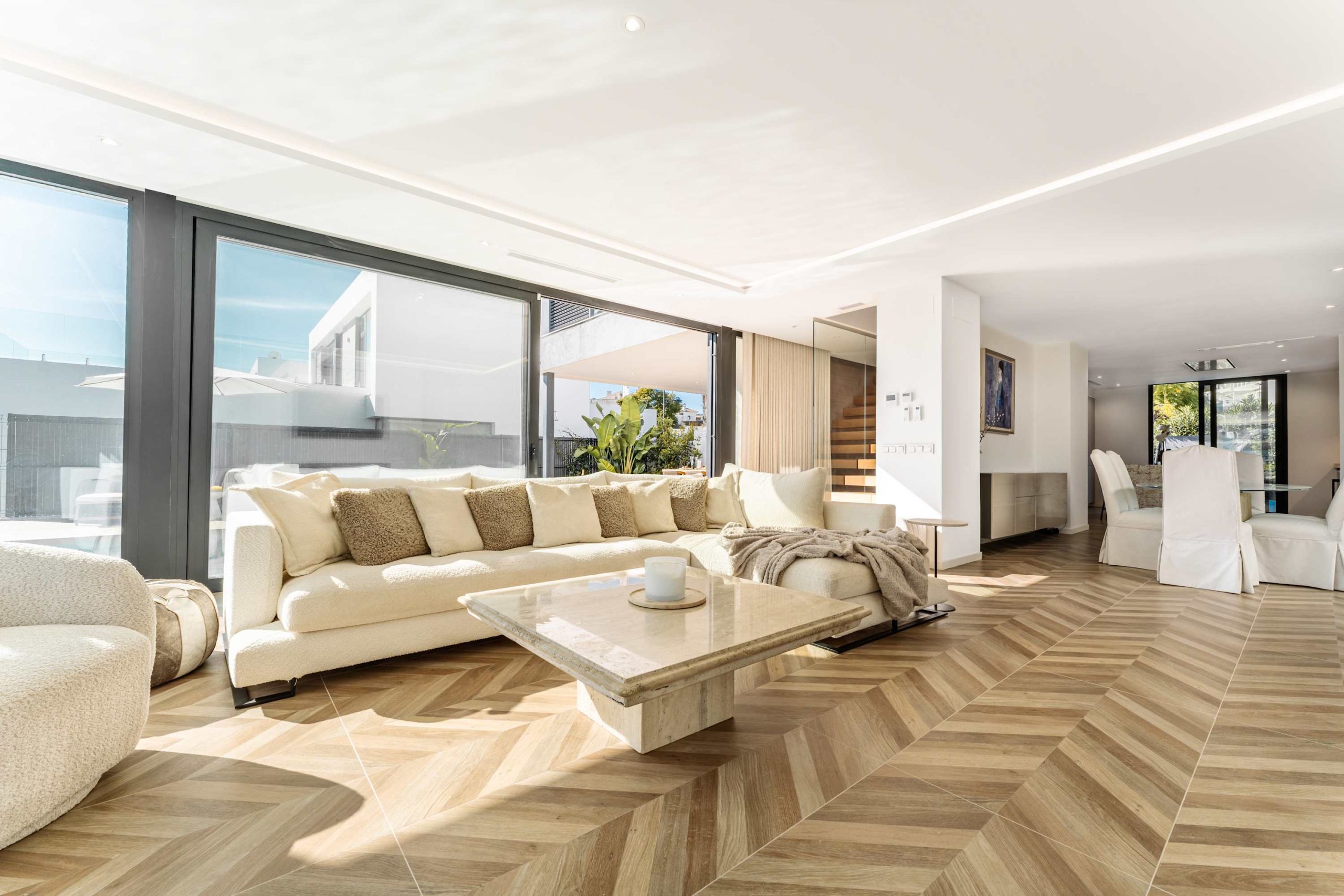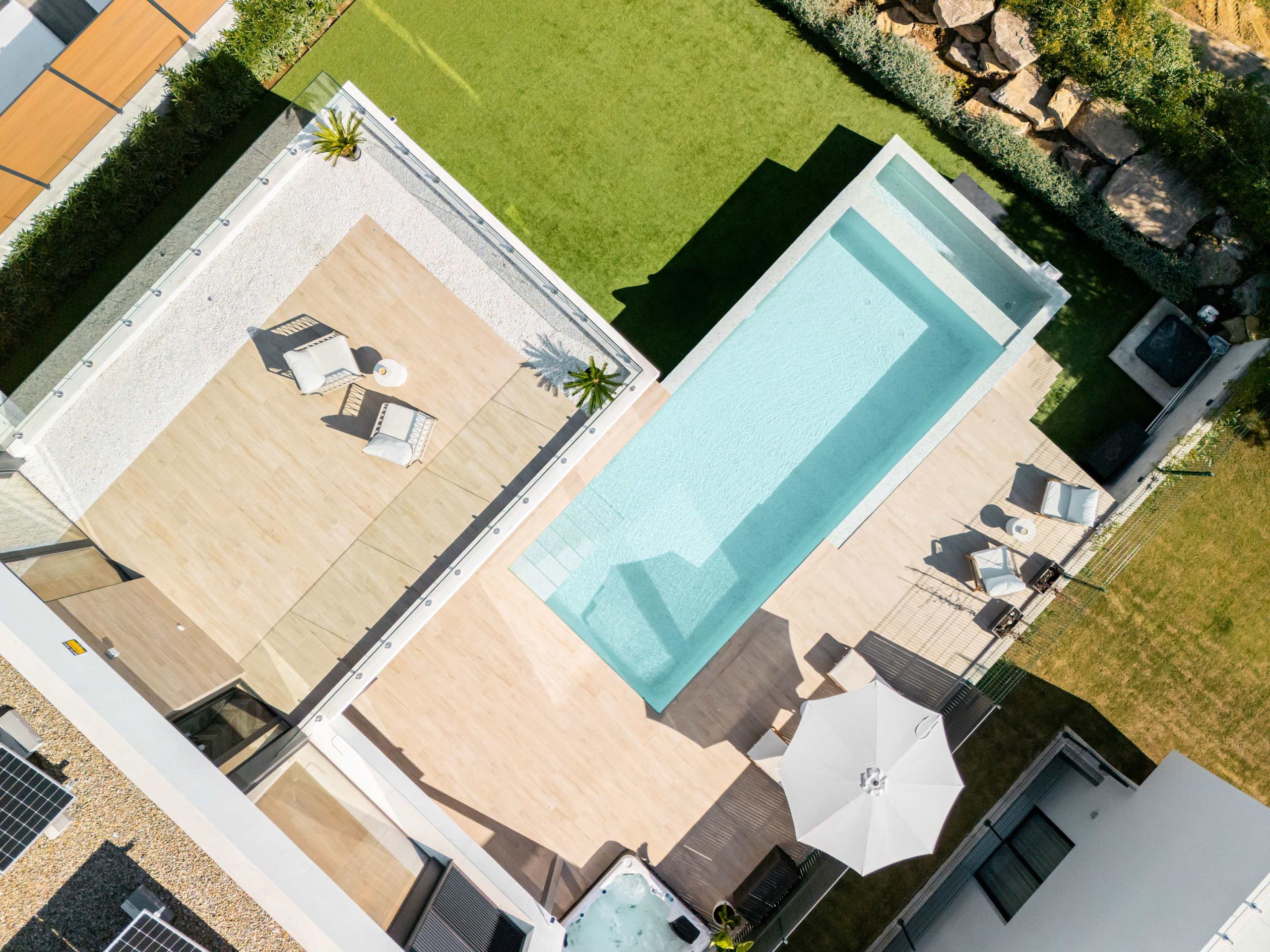 Step outside to a beautiful private garden, where a sparkling pool, sunbeds, and lounge areas invite you to unwind. Enjoy the jacuzzi or simply take in the peaceful surroundings, this villa is designed for relaxation.
