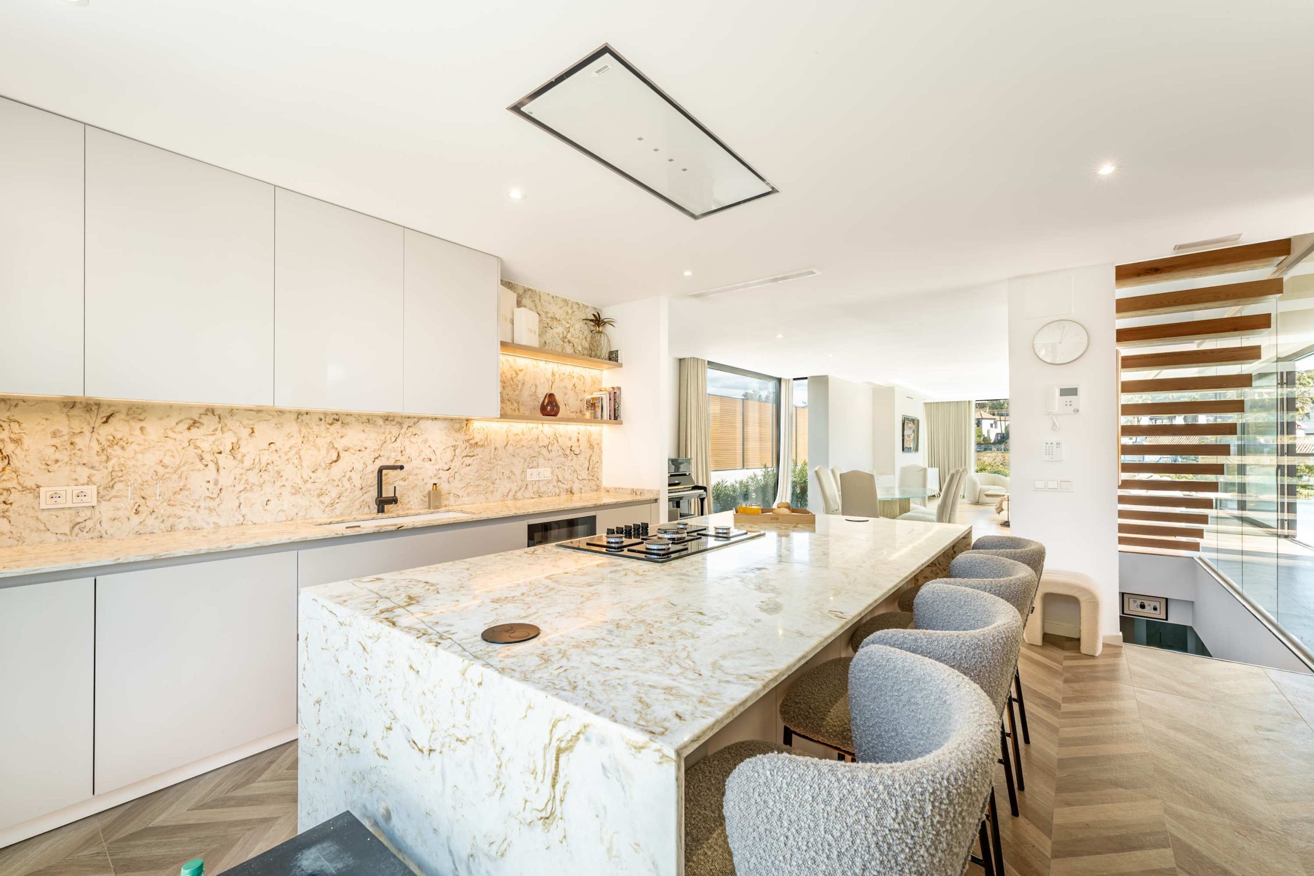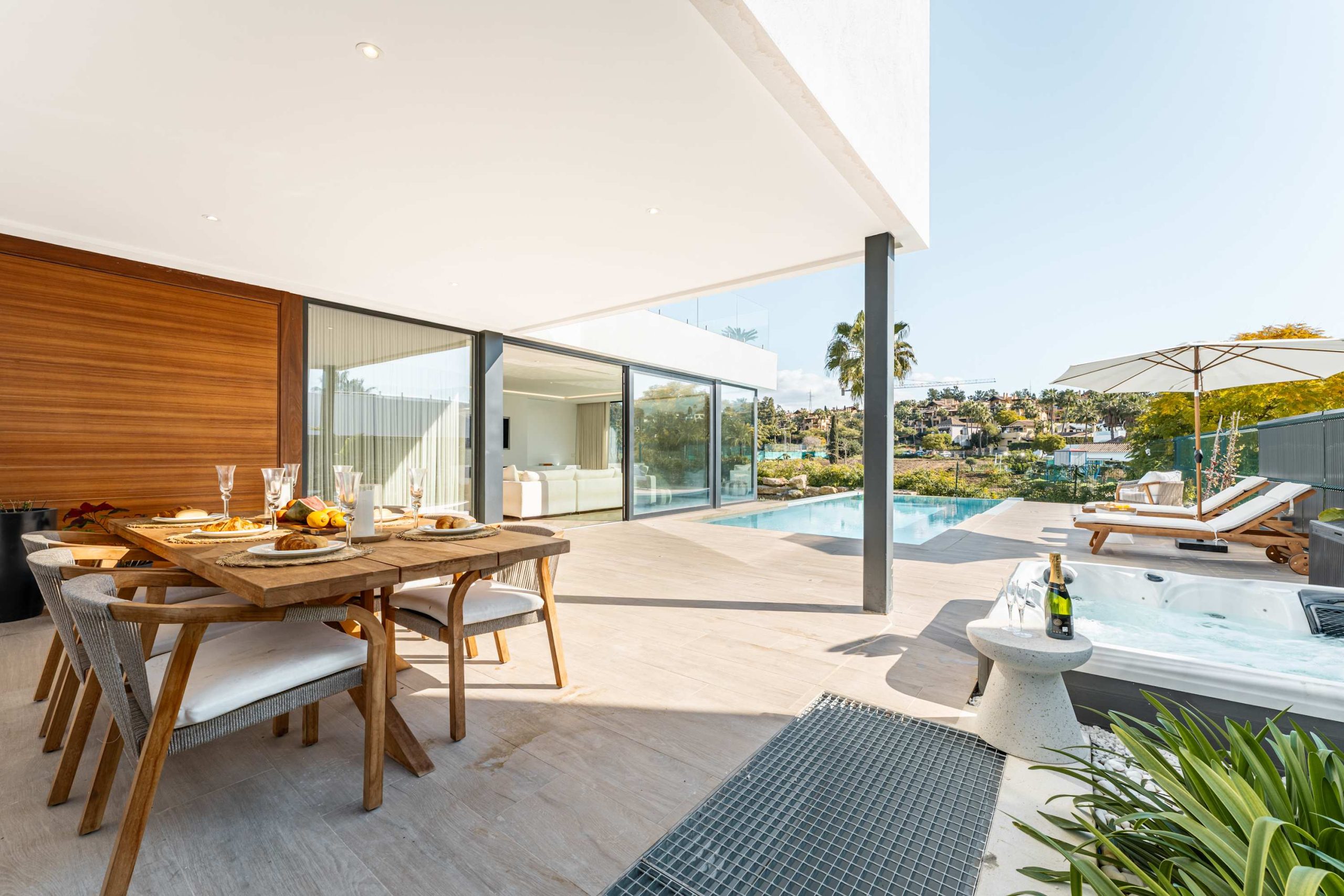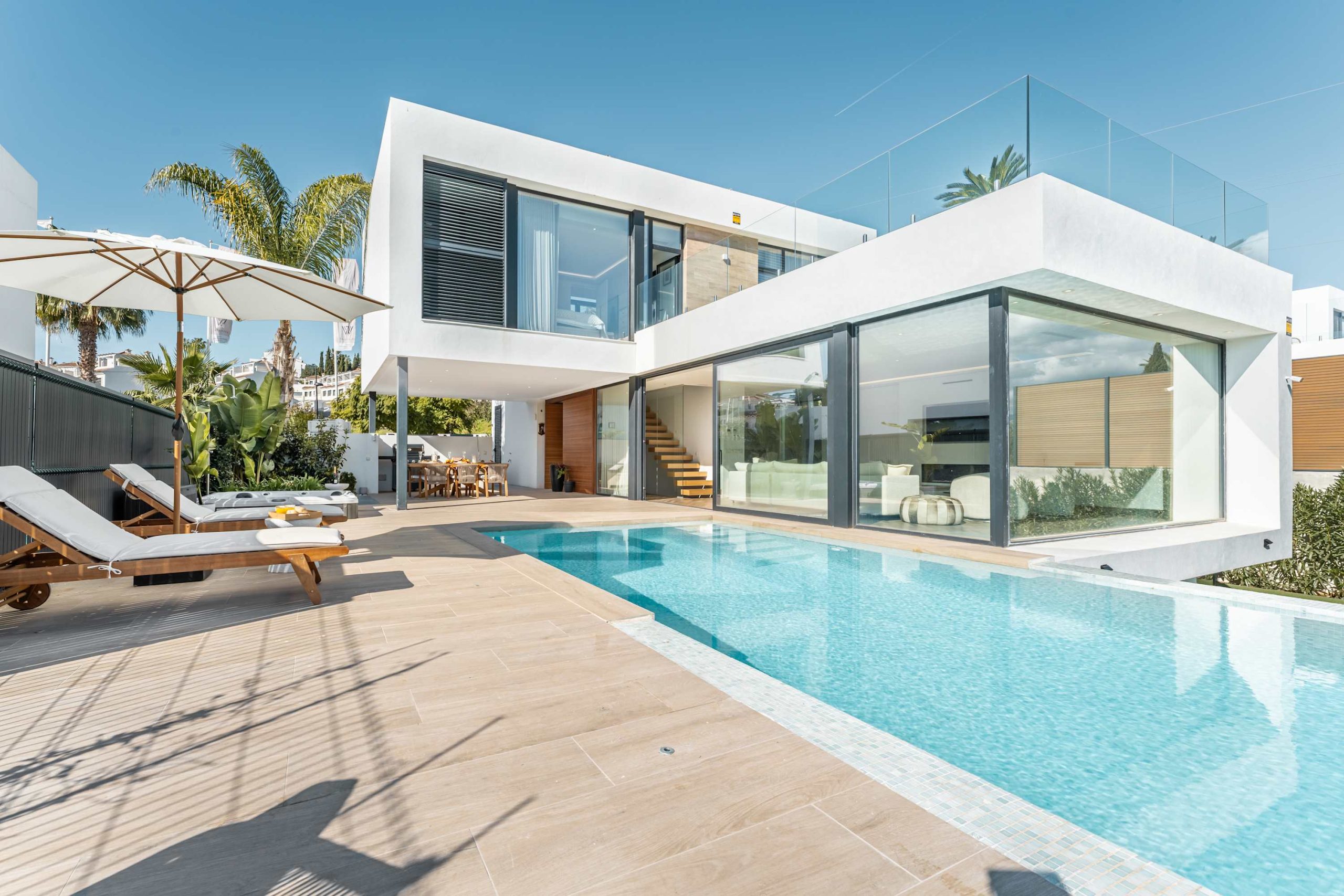 Experience modern comfort and style at Villa Campanario beautiful retreat for up to 8 guests. With 4 spacious bedrooms and 4 bathrooms, this villa is perfect for families and friends looking to relax in a peaceful setting. Designed with high quality materials, the villa features a bright, open plan layout that fills the space with natural light. The impressive entrance hall leads to a spacious living area with stunning views through floor to ceiling windows. The fully equipped kitchen, complete with a central island and breakfast area, is ideal for gathering, while the outdoor barbecue and dining space make al fresco meals a delight.
