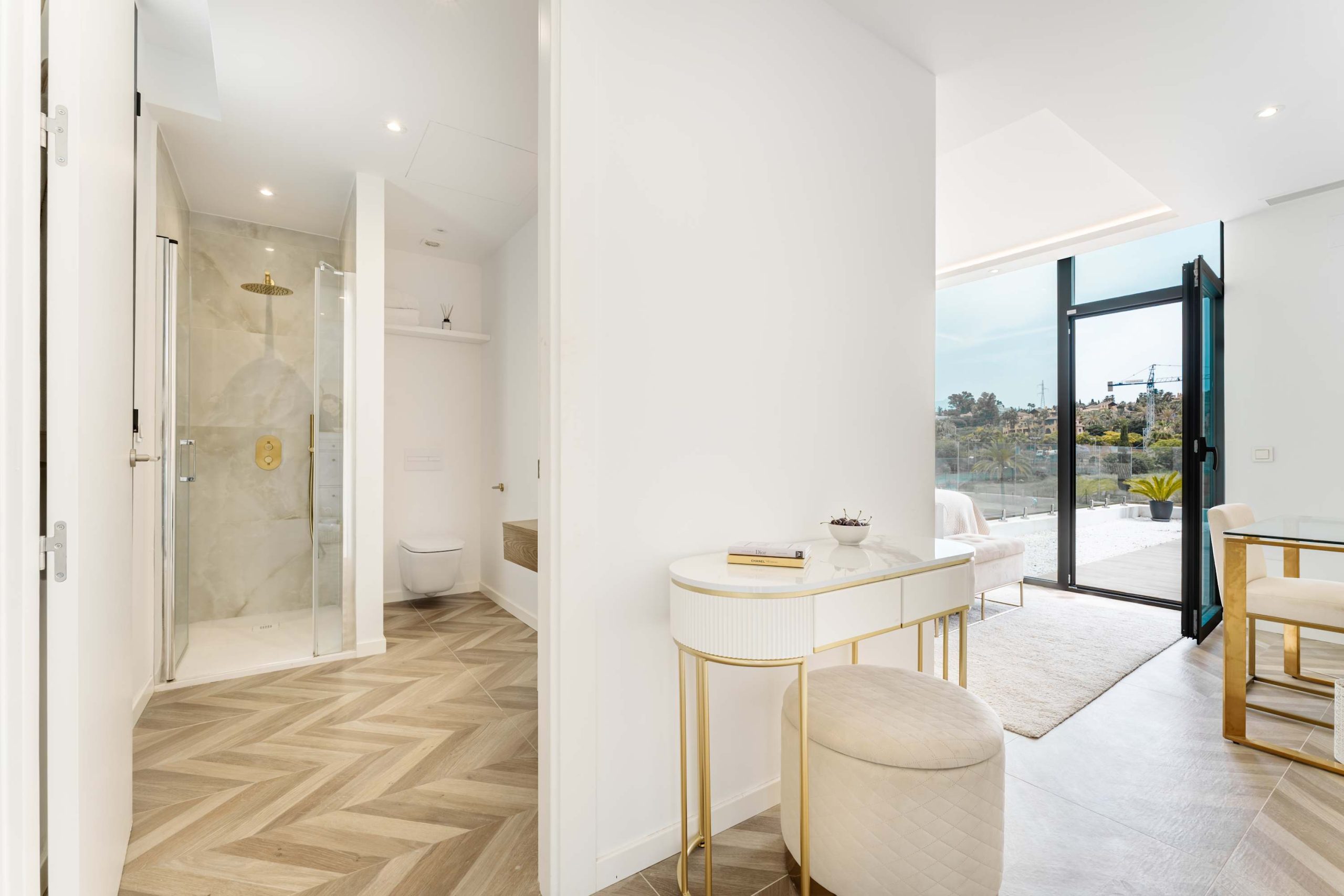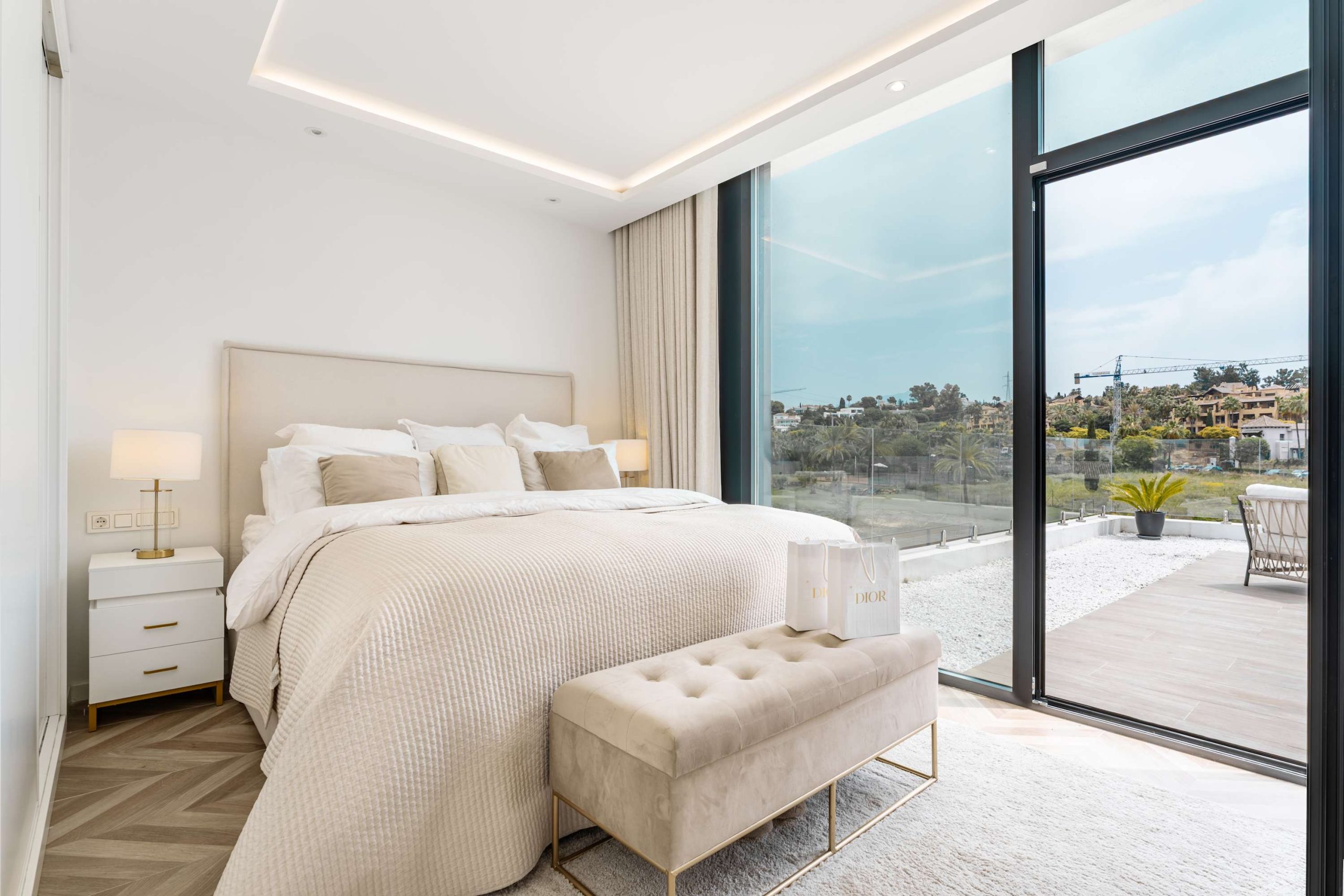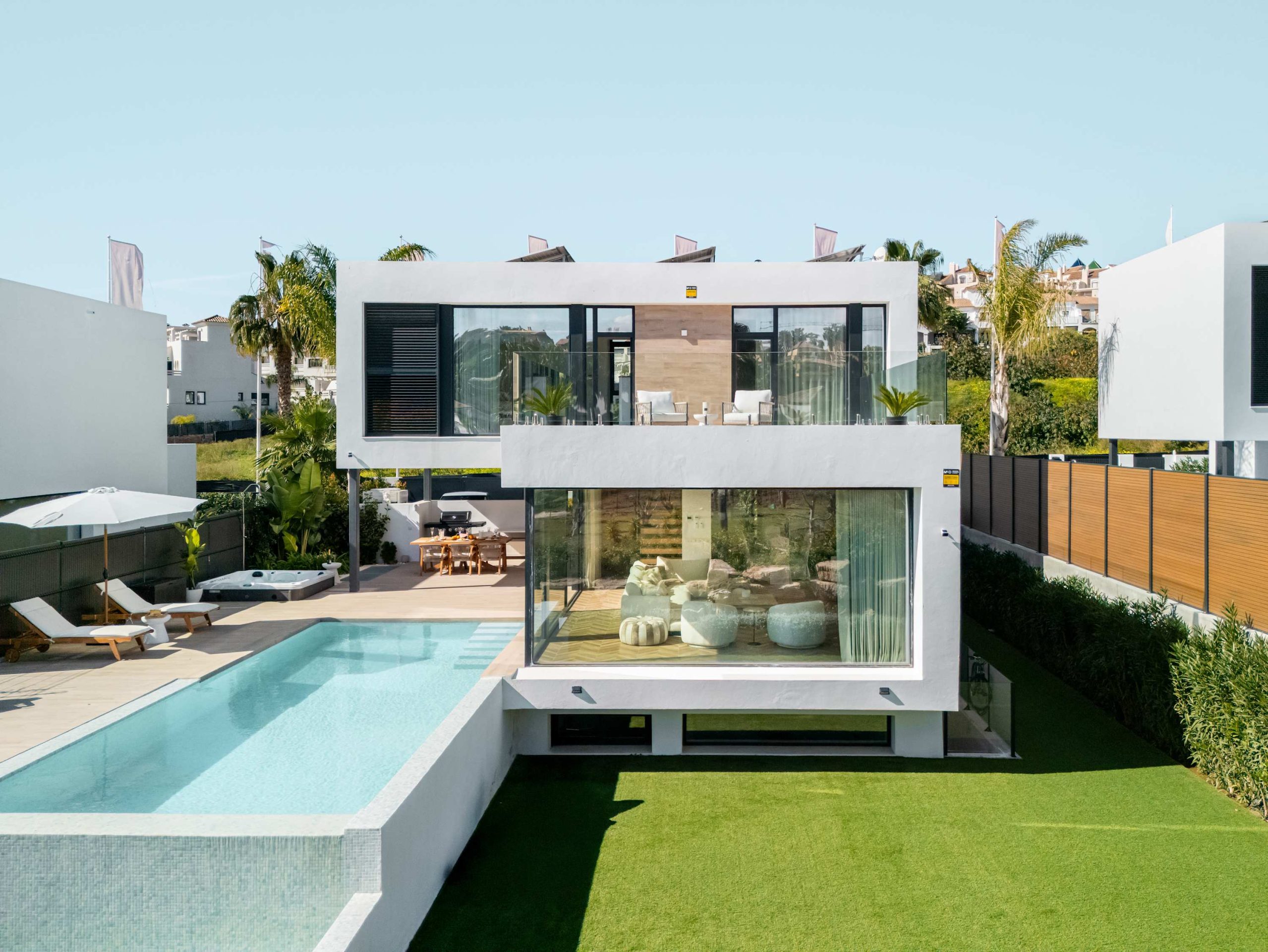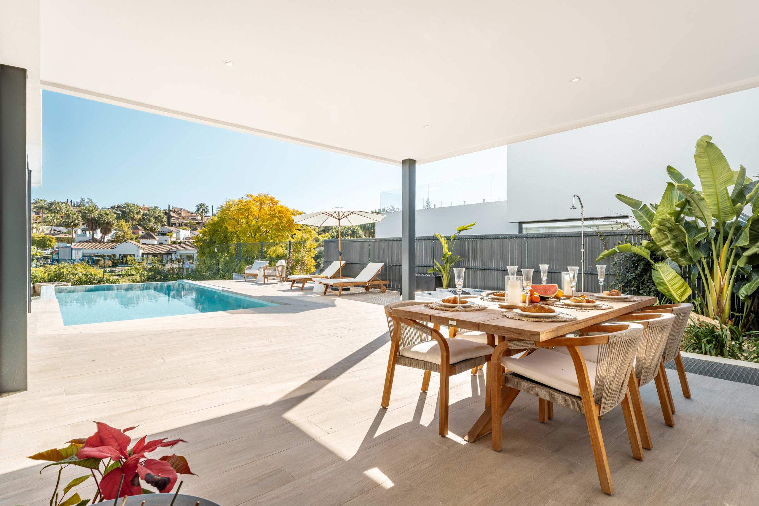 Experience modern comfort and style at Villa Campanario beautiful retreat for up to 8 guests. With 4 spacious bedrooms and 4 bathrooms, this villa is perfect for families and friends looking to relax in a peaceful setting. Designed with high quality materials, the villa features a bright, open plan layout that fills the space with natural light. The impressive entrance hall leads to a spacious living area with stunning views through floor to ceiling windows. The fully equipped kitchen, complete with a central island and breakfast area, is ideal for gathering, while the outdoor barbecue and dining space make al fresco meals a delight.